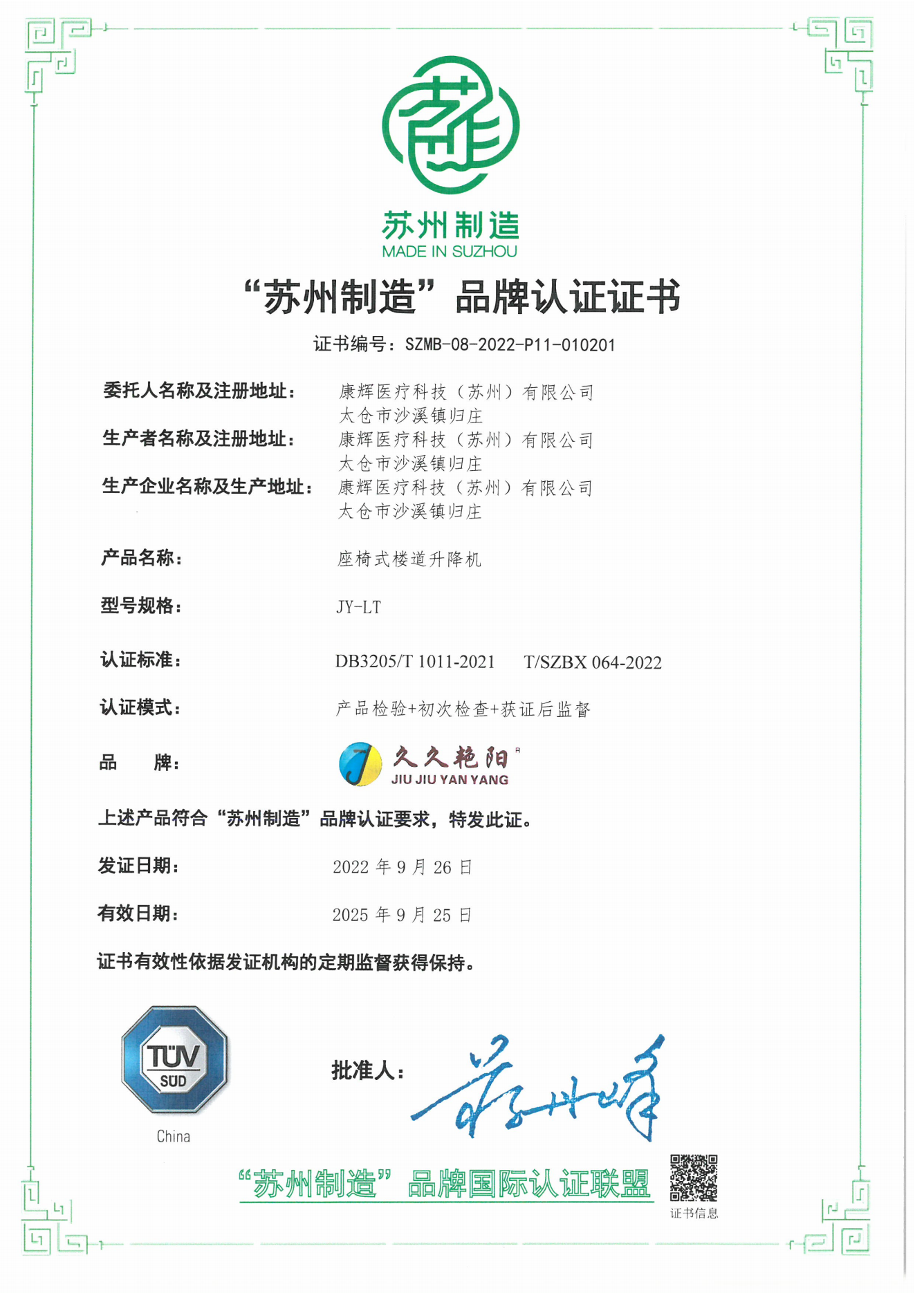 康輝醫(yī)療科技經過前期的標準制定、現場認證等工作,于2022年9月正式獲得蘇州制造”品牌認證證書??递x公司進一步打響蘇州制造品牌,讓質量工作更好地提升企業(yè)核心競爭力。